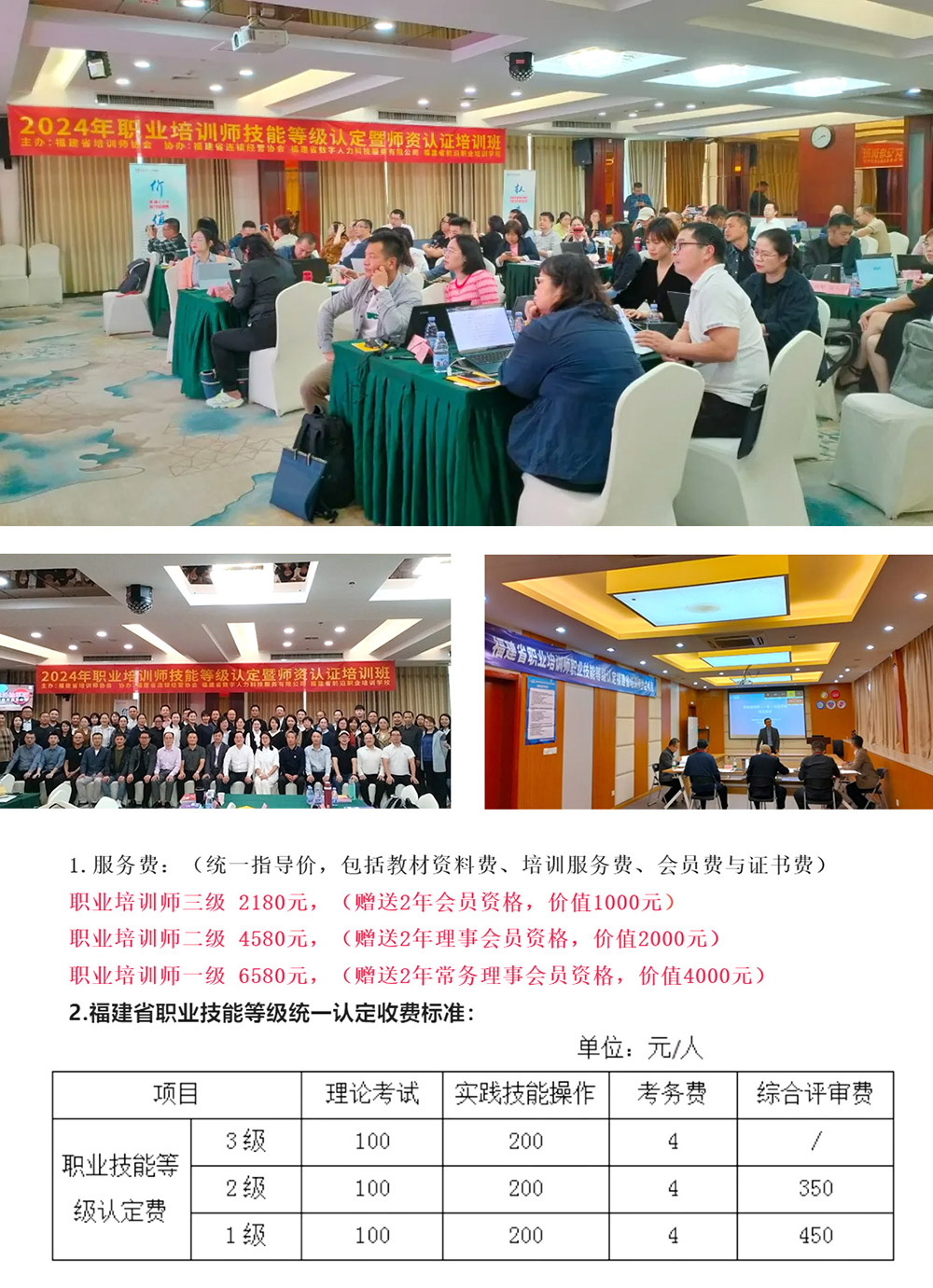 1.證書政府授權(quán)、官方認可:學(xué)員評價合格將取得由政府認可、國家人社部官網(wǎng)驗證的職業(yè)培訓(xùn)師職業(yè)技能等級證書,證書是目前政府唯一認可的職業(yè)培訓(xùn)師等級證書,解決了廣大培訓(xùn)師參與政府采購與國有企業(yè)培訓(xùn)項目的講師資格與有效身份的痛點。2.課程實戰(zhàn)實用、專業(yè)系統(tǒng):通過培訓(xùn)讓培訓(xùn)師了解職業(yè)綜合素質(zhì)能力要求,掌握培訓(xùn)項目需求調(diào)研與項目開發(fā)方法,提升教學(xué)設(shè)計能力并運用成人學(xué)習(xí)原理和科學(xué)標(biāo)準進行高效教學(xué),強化教學(xué)組織與教學(xué)質(zhì)量管理能力,掌握技能人才培養(yǎng)、人才梯隊建設(shè)咨詢服務(wù)能力,全面提升培訓(xùn)講師的綜合能力與職業(yè)競爭力。3.學(xué)員師資服務(wù)、市場推廣:取得等級證書的優(yōu)秀學(xué)員,經(jīng)協(xié)會評審合格頒發(fā)福建省職業(yè)培訓(xùn)師技能等級評價授權(quán)認證講師證書,納入?yún)f(xié)會培訓(xùn)師認證師資庫,作為全省及全國范圍內(nèi)開展職業(yè)培訓(xùn)師等級認定培訓(xùn)班的授課師資推薦到全省的合作培訓(xùn)機構(gòu)與企事業(yè)單位開展培訓(xùn)授課。4.會員磨課沙龍、強化技能:報名學(xué)員贈送兩年會員資格,頒發(fā)會員證書,享有協(xié)會相應(yīng)等級會員權(quán)益,免費參加協(xié)會及合作基地組織的講師磨課沙龍、主題論壇、專題沙龍、講師大賽等會員專屬活動。5.學(xué)員繼續(xù)教育、個稅福利:取得職業(yè)培訓(xùn)師證書學(xué)員,按國家相關(guān)稅收政策享有個人所得稅3600元額度專項退稅權(quán)益。(以最新政策為準)6.培訓(xùn)政策支持、見證補貼:取證人員享有省市人社部門技能人才見證補貼培訓(xùn)政策,根據(jù)各地政策執(zhí)行的不同,享有培訓(xùn)費與考試費補貼,享有專業(yè)培訓(xùn)服務(wù)的同時,大大降低學(xué)員學(xué)習(xí)考證的費用成本。(以最新政策為準)【符合條件的可以申請政府補貼:1500元(三級),2000元(二級),3000元(一級)】