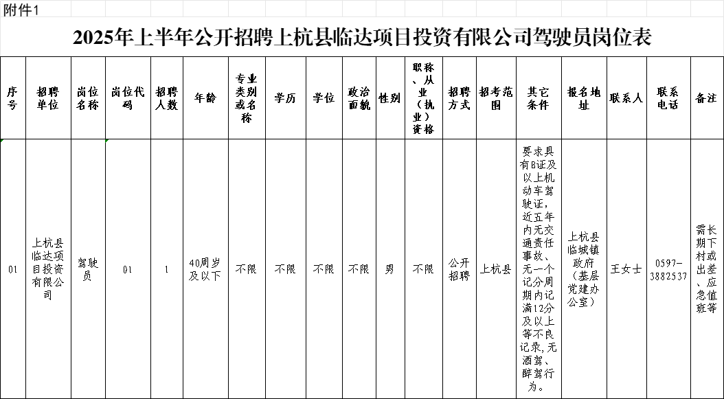 1.2025年上半年公開招聘上杭縣臨達項目投資有限公司駕駛員崗位表