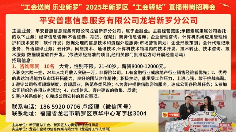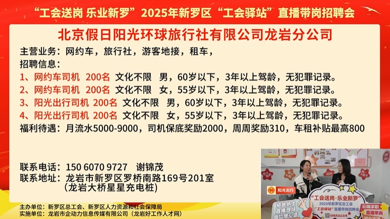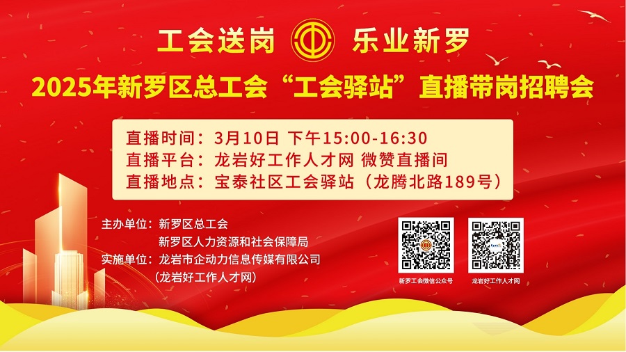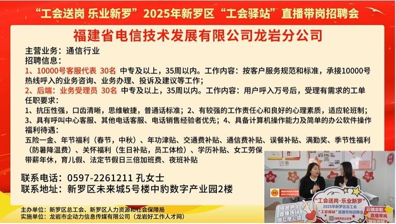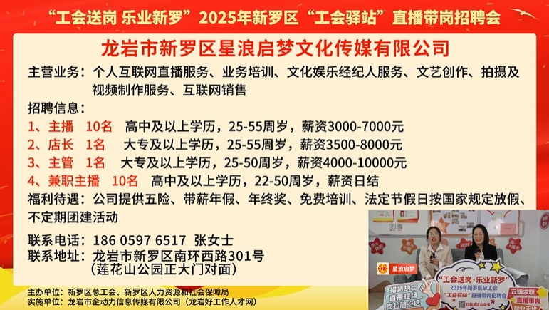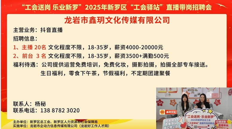 此次招聘會由新羅區(qū)總工會主辦;龍巖市企動力信息傳媒有限公司(龍巖好工作人才網(wǎng))實施,以“工會送崗 樂業(yè)新羅”為主題,組織了7家企業(yè)到場直播,企業(yè)通過“坐播”的形式在龍巖好工作人才網(wǎng)微贊直播間及龍巖好工作人才網(wǎng)視頻號開展直播帶崗活動。