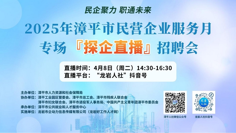 為全面貫徹黨的二十大精神和二十屆二中全會精神,堅決落實黨中央、國務院關于就業(yè)工作的決策部署,進一步做好新形勢下就業(yè)創(chuàng)業(yè)工作,全力支持我市各類人才高質(zhì)量充分就業(yè),助力我市企業(yè)經(jīng)濟發(fā)展實現(xiàn)“開門紅、開門穩(wěn)”提供有效的人力資源保障,漳平市人力資源和社會保障局現(xiàn)決定舉辦“民企聚力 職通未來”2025年漳平市民營企業(yè)服務月專場探企直播招聘會。