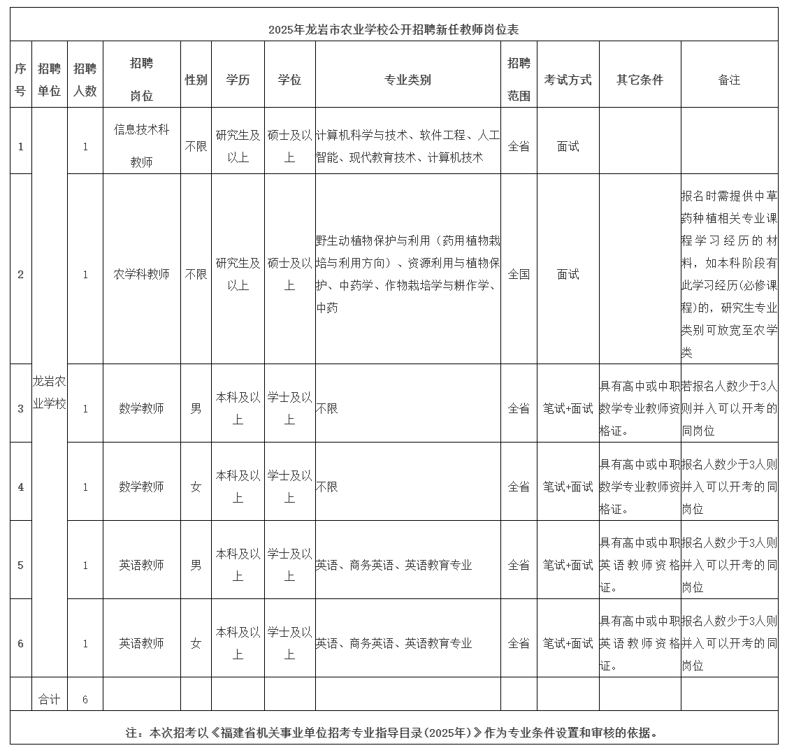招聘信息技術(shù)科、農(nóng)學(xué)科教師各1名,數(shù)學(xué)、英語(yǔ)教師各2名,共6名。各崗位的具體要求,詳見(jiàn)附件《2025年龍巖市農(nóng)業(yè)學(xué)校公開(kāi)招聘新任教師崗位表》(以下簡(jiǎn)稱《崗位表》)。
