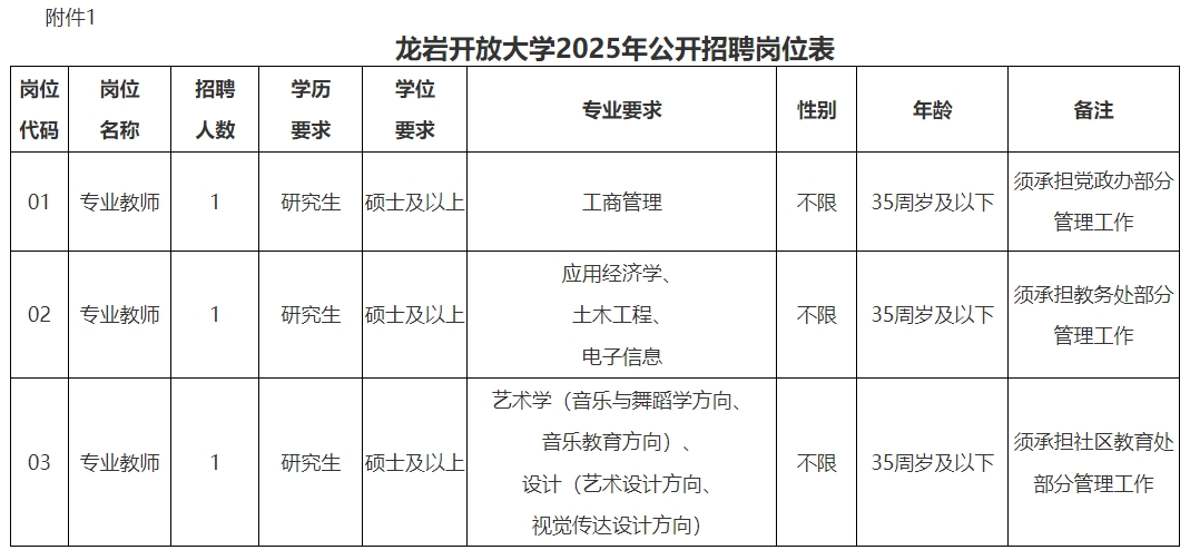 附件:1.龍巖開(kāi)放大學(xué)2025年公開(kāi)招聘崗位表