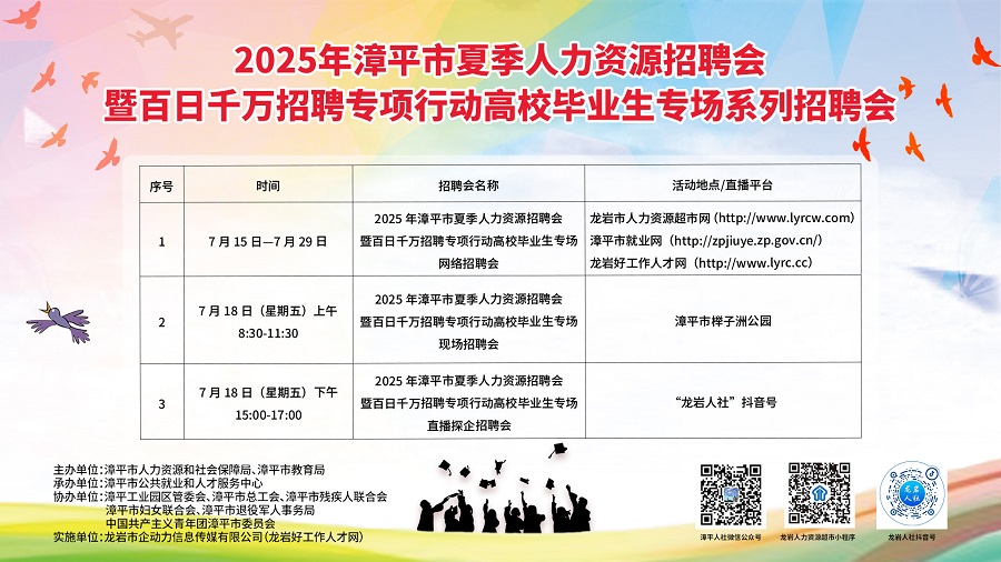 2025年漳平市夏季人力資源招聘會(huì)暨百日千萬(wàn)招聘專項(xiàng)行動(dòng)高校畢業(yè)生專場(chǎng)直播探企招聘會(huì) |