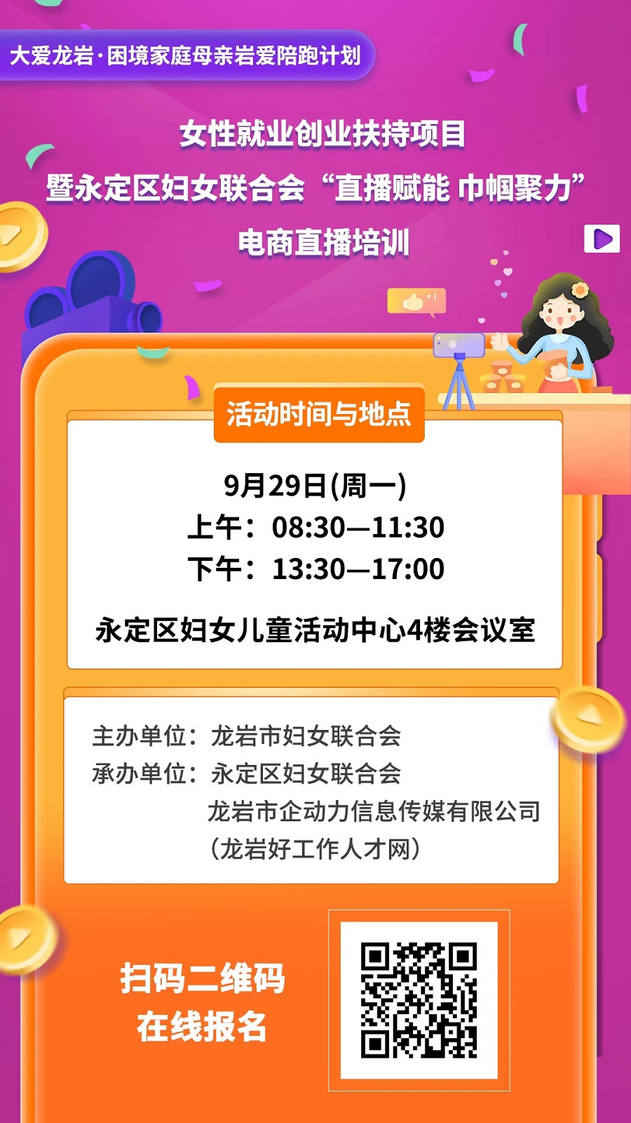 永定區(qū)有電商直播創(chuàng)業(yè)意愿的城鄉(xiāng)女性;待業(yè)、下崗女性及全職媽媽群體;有意拓展線上渠道的女性個(gè)體工商戶等女性群體。