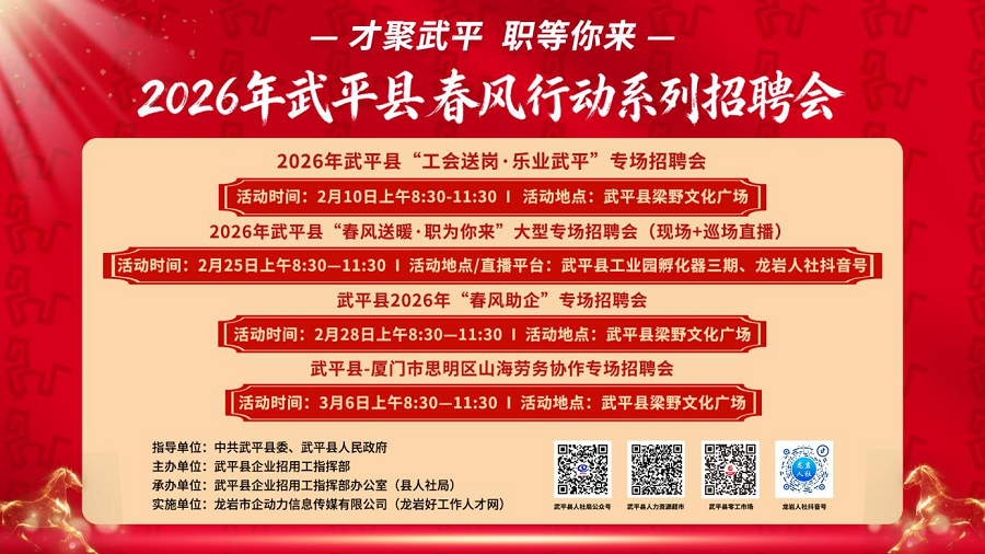 2026年武平縣“春風(fēng)送暖·職為你來” 大型專場招聘會 (現(xiàn)場+巡場直播) |