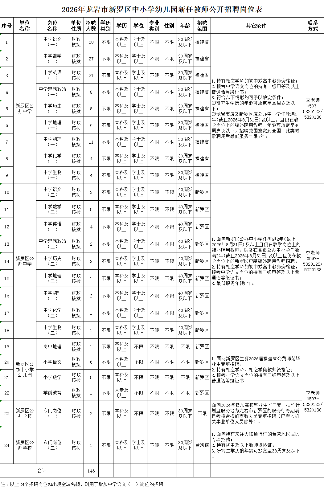 本次公開招聘的崗位為新羅區(qū)事業(yè)編制教師。計(jì)劃招聘人數(shù)146名,其中:中學(xué)教師132名(含新羅生源2026屆福建省公費(fèi)師范畢業(yè)生1名、臺(tái)灣籍教師1名);小學(xué)教師11名(新羅生源