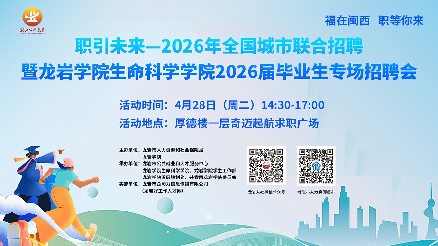 為搶抓春季就業(yè)黃金期,助力高校畢業(yè)生與用人單位“雙向奔赴”,2026年4月28日(周二)14:30-17:00,龍巖市人力資源和社會(huì)保障局聯(lián)合龍巖學(xué)院在龍巖學(xué)院厚德樓一層奇邁起航求職廣場(chǎng)舉辦“職引未來(lái)—2026年全國(guó)城市聯(lián)合招聘暨龍巖學(xué)院生命科學(xué)學(xué)院2026屆畢業(yè)生專場(chǎng)招聘會(huì)”。誠(chéng)邀廣大用人單位和求職者踴躍參與!