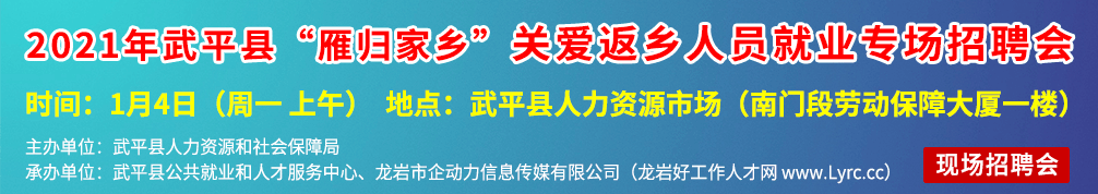 舉辦單位:武平縣人力資源和社會保障局 承辦單位:武平縣公共就業(yè)和人才服務中心、龍巖市企動力信息傳媒有限公司(龍巖好工作人才網(wǎng))