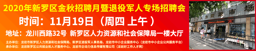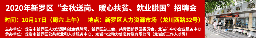 舉辦單位:龍巖市新羅區(qū)人力資源和社會保障局 協(xié)辦單位:企動力好工作人才網(wǎng)(m.jinhangda.com.cn)
