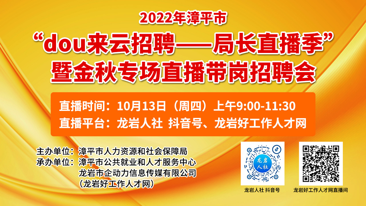 舉辦地點(diǎn):龍巖人社 抖音號(hào)、龍巖好工作人才網(wǎng)直播間