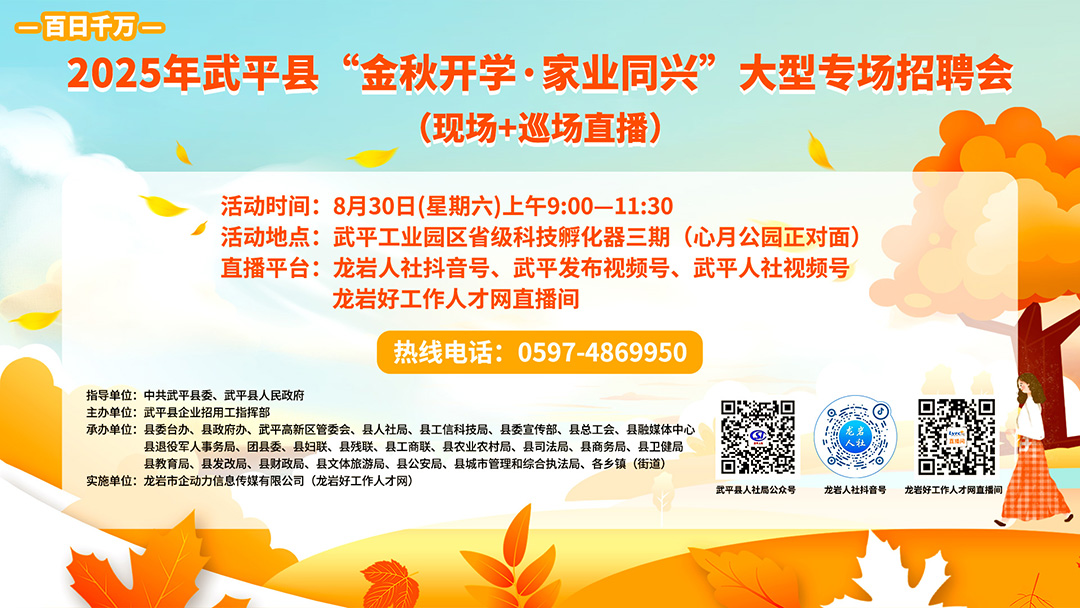 舉辦單位:新羅區(qū)人力資源和社會保障局、新羅區(qū)總工會共青團新羅區(qū)委、龍巖市新羅區(qū)婦女聯(lián)合會龍巖市新羅區(qū)殘疾人聯(lián)合會、新羅區(qū)退役軍人事務(wù)局