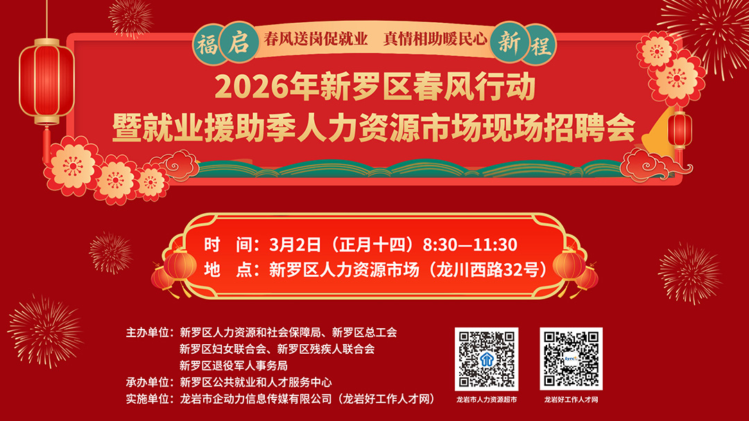 舉辦單位:新羅區(qū)人力資源和社會(huì)保障局 新羅區(qū)總工會(huì) 新羅區(qū)婦女聯(lián)合會(huì) 新羅區(qū)殘疾人聯(lián)合會(huì) 新羅區(qū)退役軍人事務(wù)局