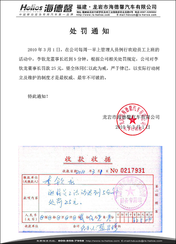 某天早上,董事長(zhǎng)因?yàn)橛惺碌R,上班迎接員工活動(dòng)遲到了5分鐘。很多人覺(jué)得,5分鐘嘛,沒(méi)什么的。但是現(xiàn)代社會(huì),遲到1秒鐘可能就會(huì)貽誤良機(jī),致使情勢(shì)瞬變。海德馨始終認(rèn)為守時(shí)是尊重人的最基本要求之一,并規(guī)定遲到時(shí)間為10分鐘內(nèi)的每分鐘處罰5元,5分鐘就是25元。董事長(zhǎng)在當(dāng)天就主動(dòng)將這25元交到財(cái)務(wù),“換取”了一張“罰單”,并在翌日的早會(huì)上向員工道歉。