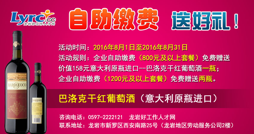 活動(dòng)對(duì)象:新老客戶均可參加,但必須通過(guò)龍巖好工作人才網(wǎng)在線自助繳費(fèi)支付成功的客戶(800元及以上套餐),可獲得一瓶?jī)r(jià)值158元意大利原瓶進(jìn)口--巴洛克干紅葡萄酒,1200元及以上套餐可獲得兩瓶,付款成功后免費(fèi)包郵送貨上門;