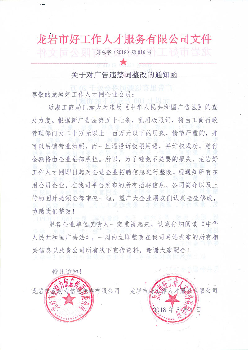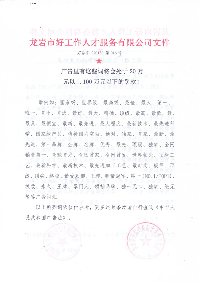 本網(wǎng)站經(jīng)福建省龍巖市人社局批準(zhǔn),為正規(guī)合法人才網(wǎng)站,人力資源服務(wù)許可證:(閩)人服證字〔2019〕第0801000113號(hào)