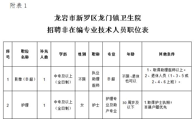 附表1:龍巖市新羅區(qū)龍門鎮(zhèn)衛(wèi)生院招聘非在編專業(yè)技術(shù)人員職位表(點擊下載)