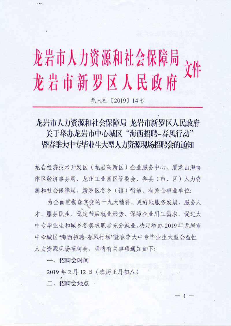 龍巖經(jīng)濟(jì)技術(shù)開發(fā)區(qū)(龍巖高新區(qū))企業(yè)服務(wù)中心、廈龍山海協(xié)作區(qū)經(jīng)濟(jì)事務(wù)局、龍州工業(yè)園區(qū)管委會、各縣(市、區(qū))人力資源和社會保障局、新羅區(qū)各鄉(xiāng)(鎮(zhèn))街道、有關(guān)企事業(yè)單位: