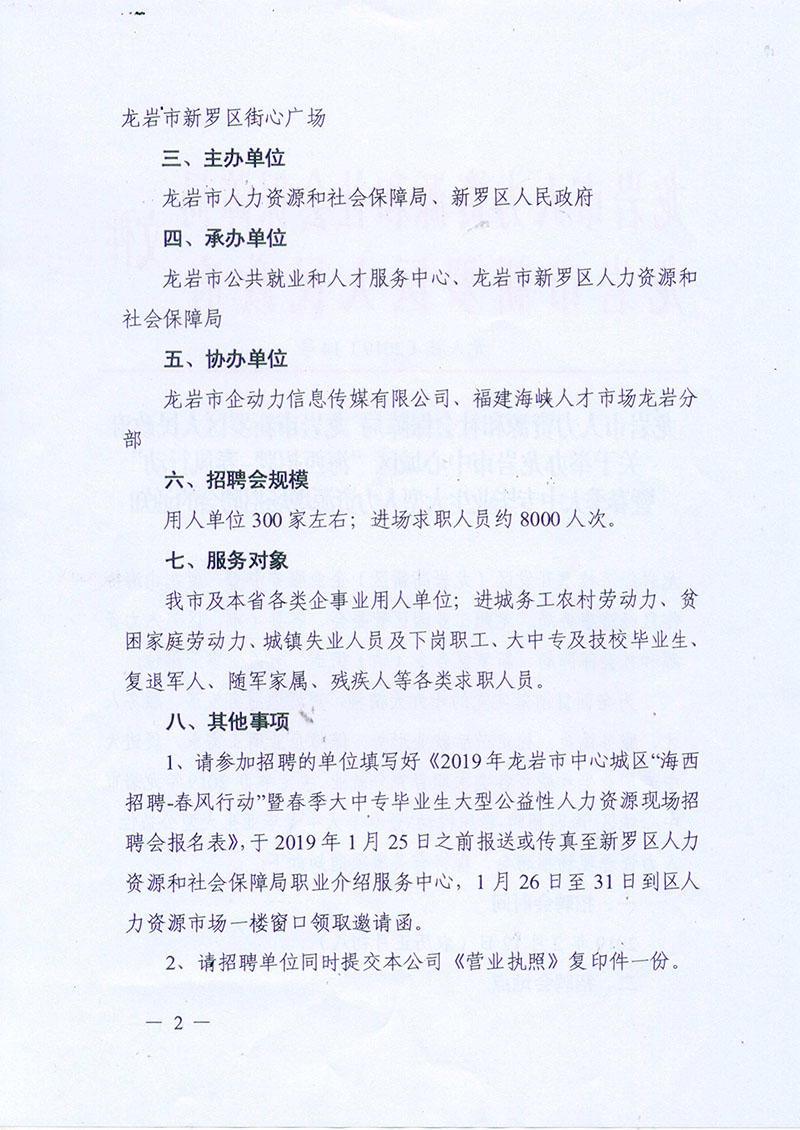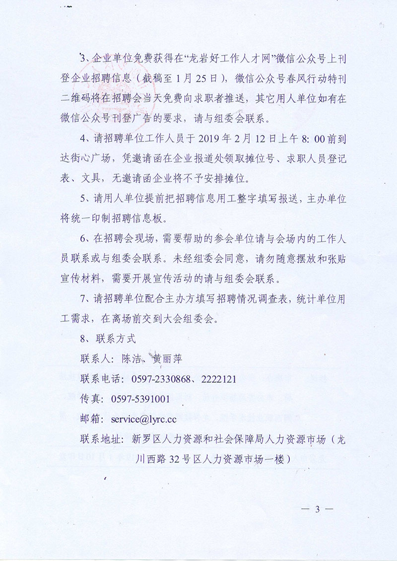 3、企業(yè)單位免費(fèi)獲得在“龍巖好工作人才網(wǎng)”微信公眾號上刊登企業(yè)招聘信息(截稿至1月25日)、微信公眾號春風(fēng)行動特刊二維碼將在招聘會當(dāng)天免費(fèi)向求職者推送,其它用人單位如有在微信公眾號刊登廣告的要求,請與組委會聯(lián)系。