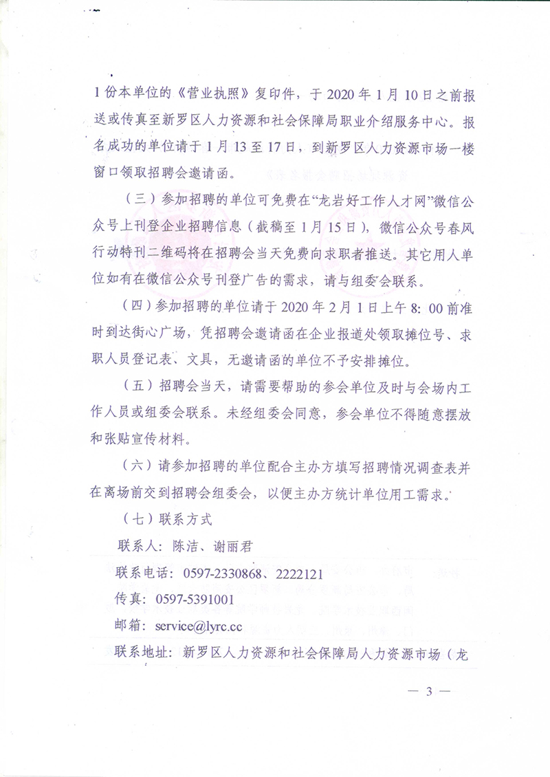 (二)參加招聘的單位需填寫好《2020年 “龍巖市人力資源超市—春風(fēng)行動”大型人力資源現(xiàn)場招聘會報(bào)名表》,同時(shí)準(zhǔn)備好1份本單位的《營業(yè)執(zhí)照》復(fù)印件,于2020年1月10日之前報(bào)送或傳真至新羅區(qū)人力資源和社會保障局職業(yè)介紹服務(wù)中心。報(bào)名成功的單位請于1月13至17日,到新羅區(qū)人力資源市場一樓窗口領(lǐng)取招聘會邀請函。