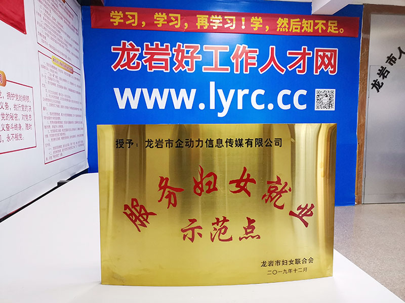 2019年12月30日上午龍巖市婦聯(lián)在好工作人才網(wǎng)二樓大廳舉行“服務(wù)婦女就業(yè)示范點(diǎn)”授牌儀式,授予龍巖市企動(dòng)力信息傳媒有限公司“服務(wù)婦女就業(yè)示范點(diǎn)”牌匾。龍巖市婦聯(lián)陳阿卿副主席、龍巖市企動(dòng)力信息傳媒有限公司總經(jīng)理張勁華及公司員工參加活動(dòng)。