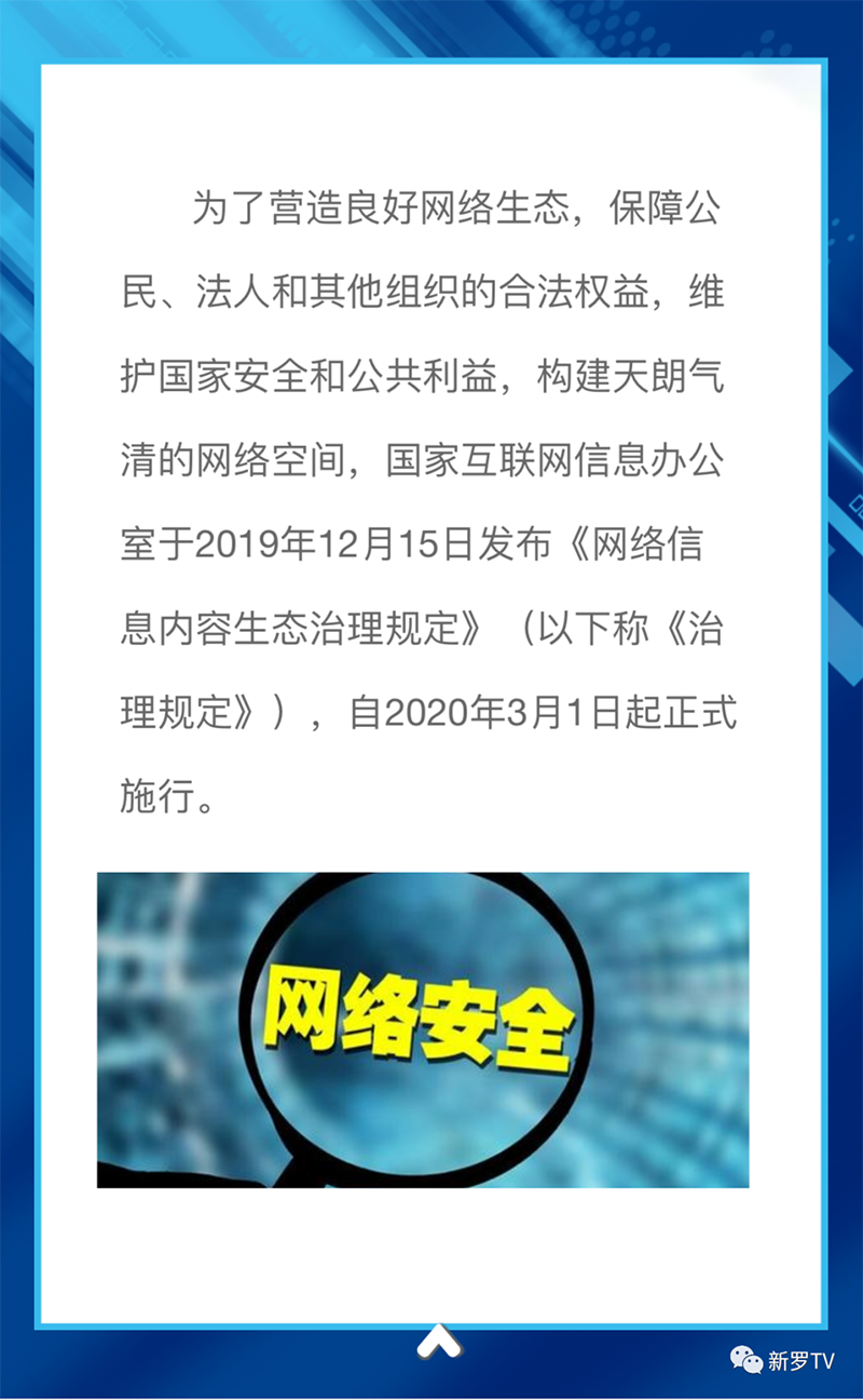 為了營造良好網(wǎng)絡(luò)生態(tài),保障公民、法人和其他組織的合法權(quán)益,維護(hù)國家安全和公共利益,構(gòu)建天朗氣清的網(wǎng)絡(luò)空間,國家互聯(lián)網(wǎng)信息辦公室于2019年12月15日發(fā)布《網(wǎng)絡(luò)信息內(nèi)容生態(tài)治理規(guī)定》,自2020年3月1日起正式施行。