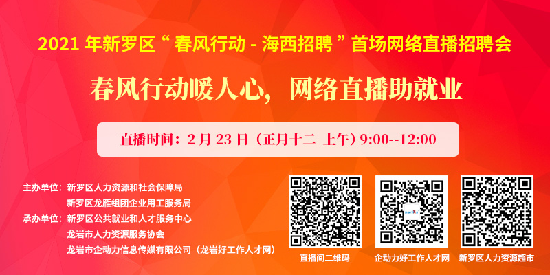 【直播回放】2021年新羅區(qū)“春風(fēng)行動—海西招聘”首場網(wǎng)絡(luò)直播招聘會公告