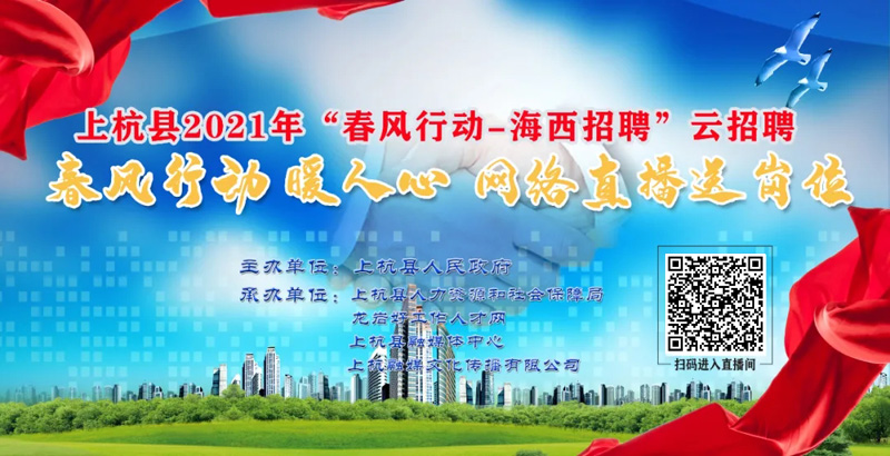 為扎實(shí)做好“六穩(wěn)”工作,落實(shí)“六保”任務(wù),全面做好新冠肺炎疫情防控工作,按照“不聚集不扎堆”的防控要求,由上杭縣人民政府主辦,上杭縣人力資源和社會(huì)保障局、龍巖好工作人才網(wǎng)、上杭縣融媒體中心、上杭融媒文化傳播有限公司承辦的“春風(fēng)行動(dòng)——海西招聘”云招聘直播帶崗活動(dòng)將于2月19日(正月初八)上午9:00舉行。