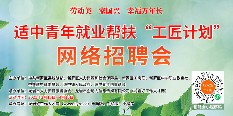 此次適中青年就業(yè)幫扶“工匠計劃”網(wǎng)絡(luò)招聘會將在龍巖好工作人才網(wǎng)招聘網(wǎng)站、微信公眾平臺、新羅TV等渠道進(jìn)行曝光,并與各自媒體平臺聯(lián)手,在微信公眾號、朋友圈、廣告等線上線下多個宣傳渠道進(jìn)行宣傳,打造2021年適中企業(yè)和青年線上招聘求職盛會。