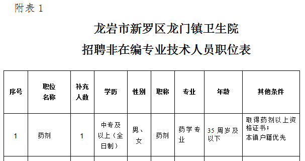 附件1:龍巖市新羅區(qū)龍門鎮(zhèn)衛(wèi)生院招聘非在編專業(yè)技術(shù)人員職位表