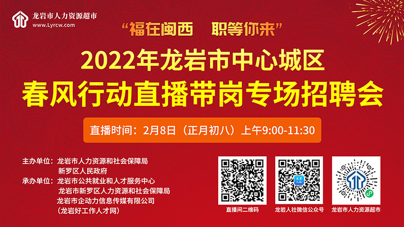 【正月初八直播】“福在閩西 職等你來”2022年龍巖市中心城區(qū)春風(fēng)行動直播帶崗專場招聘會