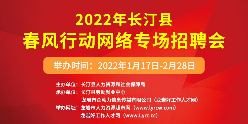 為深入學習貫徹黨的十九屆四中、五中、六中全會精神,做好新形勢下就業(yè)創(chuàng)業(yè)工作,深入實施就業(yè)優(yōu)先發(fā)展戰(zhàn)略,穩(wěn)定節(jié)后就業(yè)形勢,保障重點企業(yè)用工,促進城鄉(xiāng)勞動者合理有序流動,經研究,決定在春節(jié)期間舉辦“2022年長汀縣春風行動網絡專場招聘會”