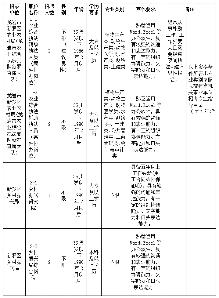 為進(jìn)一步提高單位的管理能力和服務(wù)水平,龍巖市新羅區(qū)農(nóng)業(yè)農(nóng)村局?jǐn)M面向社會公開招聘編外7名工作人員。現(xiàn)將有關(guān)事宜公告如下:
