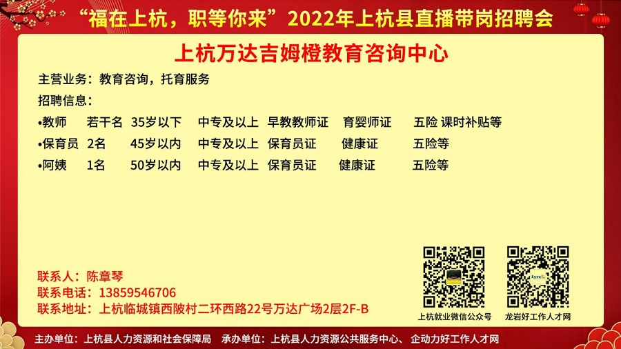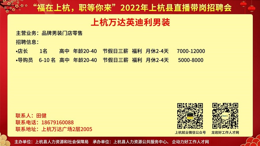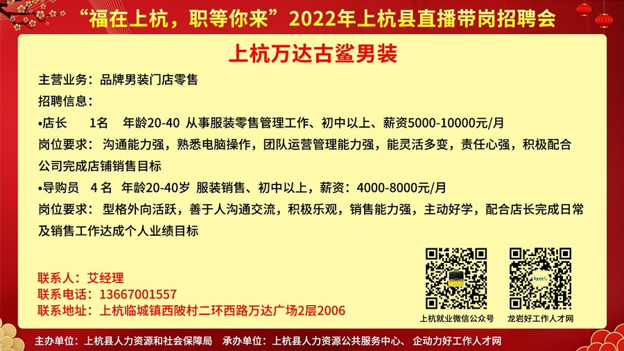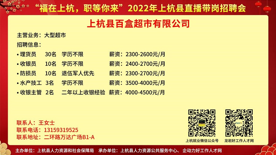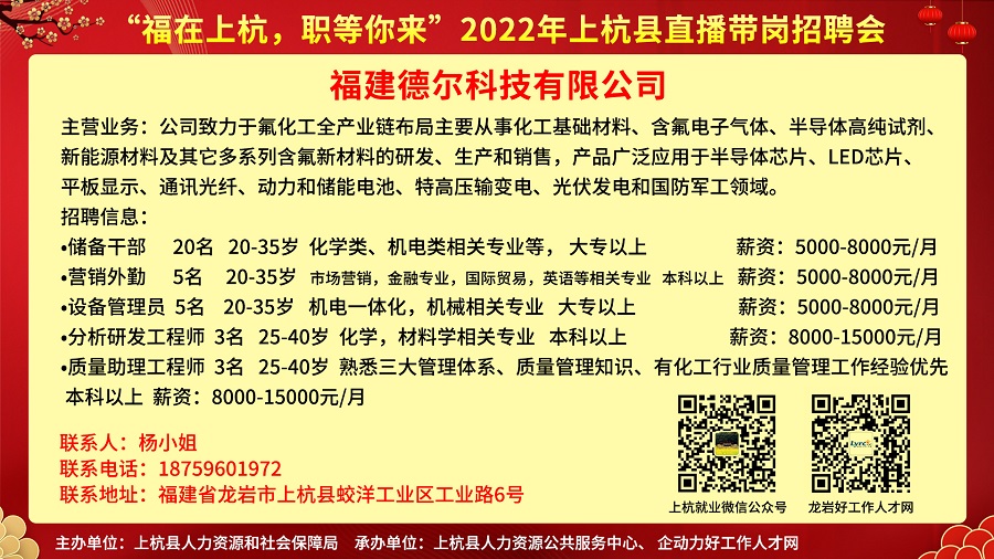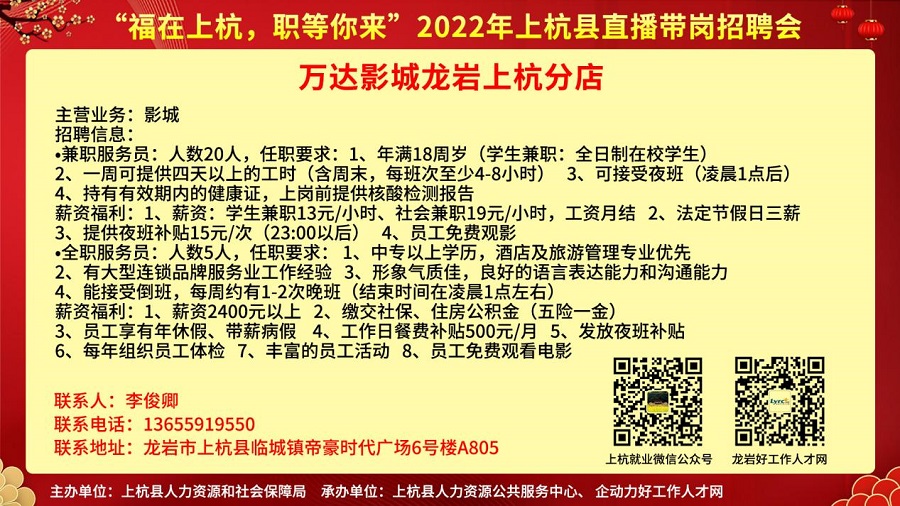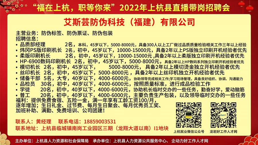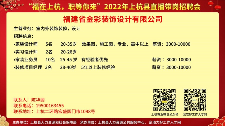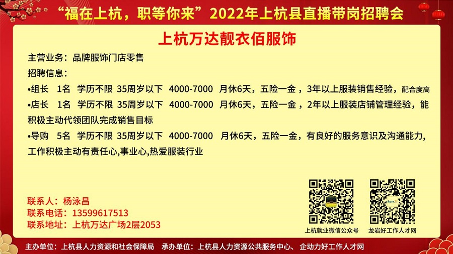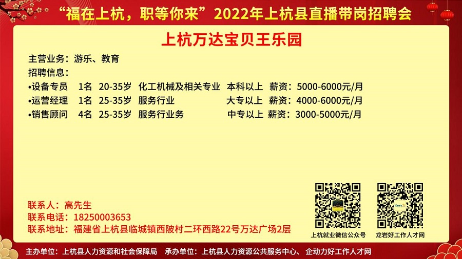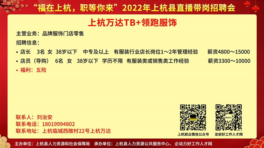 為幫助企業(yè)緩解用工難問(wèn)題,積極搭建就業(yè)服務(wù)交流平臺(tái),鼓勵(lì)求職者留杭來(lái)杭就業(yè),助力我縣企業(yè)招用工,上杭縣人社局黨組成員、副局長(zhǎng):邱文勇,為此次直播帶崗進(jìn)行了政策上的宣導(dǎo),助力本次直播帶崗招聘會(huì)的圓滿成功,幫助重點(diǎn)企業(yè)緩解招用工難問(wèn)題,多渠道組織開(kāi)展對(duì)接服務(wù),利用好線上公共人力資源市場(chǎng)服務(wù)平臺(tái),為求職者和用人單位搭建起一座溝通的橋梁,以活動(dòng)促就業(yè)、以就業(yè)促發(fā)展,大力引進(jìn)上杭縣緊缺急需的各類產(chǎn)業(yè)工人及優(yōu)秀人才,為上杭縣經(jīng)濟(jì)高質(zhì)量發(fā)展提供堅(jiān)實(shí)保障。