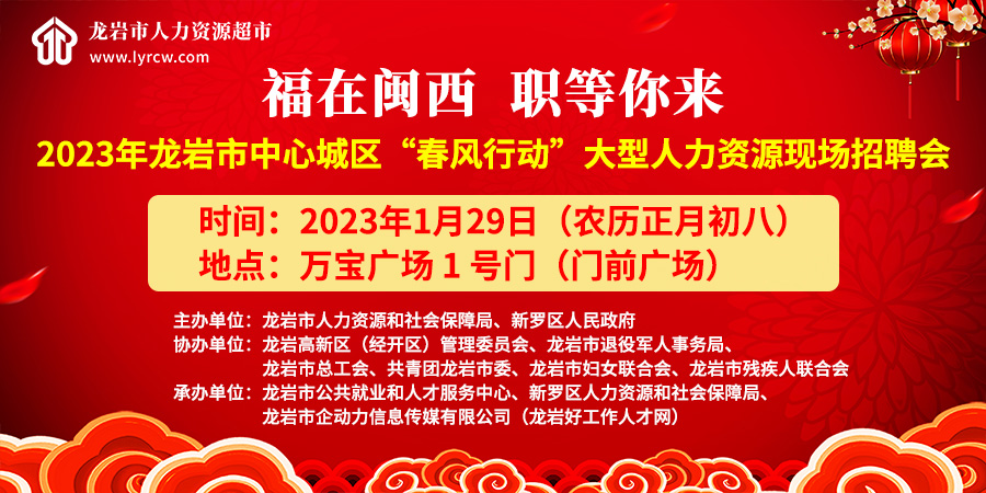 為全面貫徹黨的二十大精神,堅(jiān)決落實(shí)中央、省、市關(guān)于就業(yè)工作決策部署,搭建春節(jié)期間龍巖市中心城區(qū)企業(yè)與求職者雙向?qū)悠脚_(tái),龍巖市人力資源和社會(huì)保障局、新羅區(qū)人民政府?dāng)M聯(lián)合舉辦2023年龍巖市中心城區(qū)“春風(fēng)行動(dòng)”大型人力資源現(xiàn)場(chǎng)招聘會(huì)。