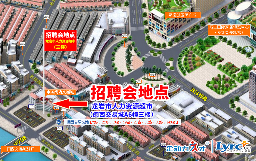 公交車線路:7路、12路、13路、19路、20路、30路、38路、50路、105路,閩西交易城站,下車右拐即到。詳情請?jiān)L問龍巖市人力資源超市網(wǎng)站(www.lyrcw.com)
