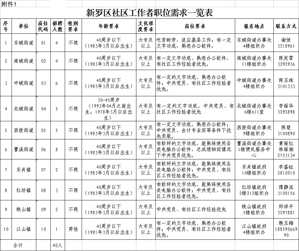 本次公開招聘社區(qū)工作者共40名。具體招聘崗位詳見附件1。