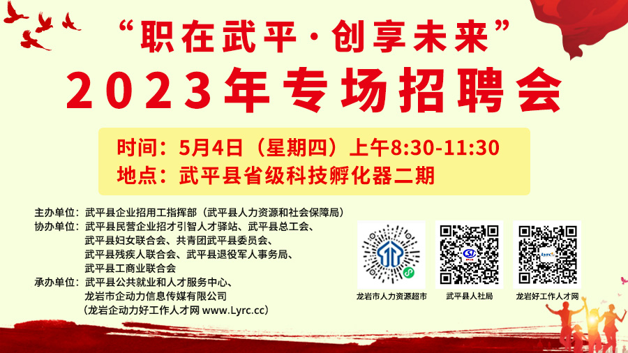 根據(jù)《武平縣企業(yè)招用工指揮部關(guān)于印發(fā)<武平縣2023年招聘會活動工作方案>的通知》文件精神,決定舉辦2023年“職在武平·創(chuàng)享未來”專場招聘會。