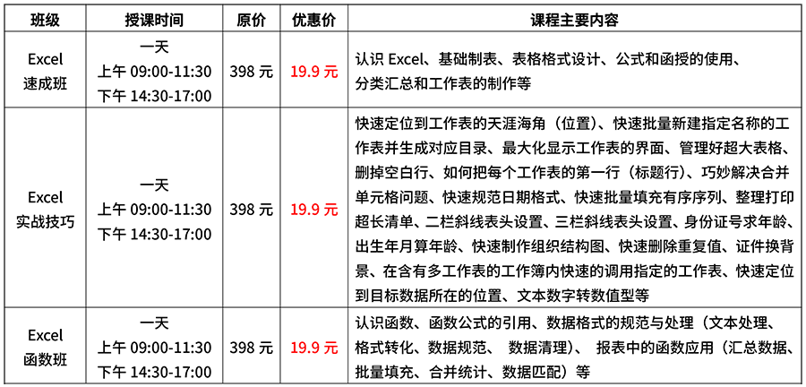Excel線下培訓一天班,兩人同時報名只需9.9元/人/班