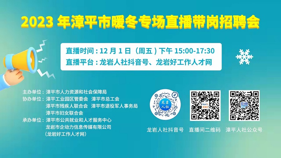 為促進(jìn)居民就地就近就業(yè),幫助各類企業(yè)招工穩(wěn)崗,暢通我市求職招聘雙向?qū)忧,漳平市人力資源和社會保障局?jǐn)M舉辦“2023年漳平市暖冬專場直播帶崗招聘會”。