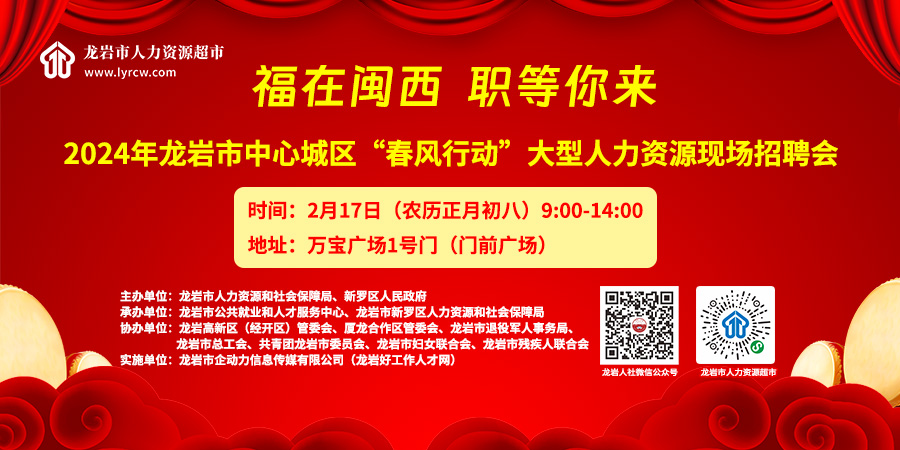 為全面貫徹黨的二十大精神和二十屆二中全會精神,堅決落實黨中央、國務院關于就業(yè)工作的決策部署,做好2024年春節(jié)期間用工服務保障工作,集中幫扶高校畢業(yè)生、農民工、退役軍人、就業(yè)困難人員等勞動者就業(yè)創(chuàng)業(yè),建立企業(yè)與高校畢業(yè)生等各類勞動者的對接交流服務平臺和聯(lián)系渠道,努力實現(xiàn)“就業(yè)有支持、用工有保障、滿意有提升”的活動目的,龍巖市人力資源和社會保障局、新羅區(qū)人民政府定于2024年2月17日(正月初八)聯(lián)合舉辦“福在閩西 職等你來”2024年龍巖市中心城區(qū)“春風行動”大型人力資源現(xiàn)場招聘會。