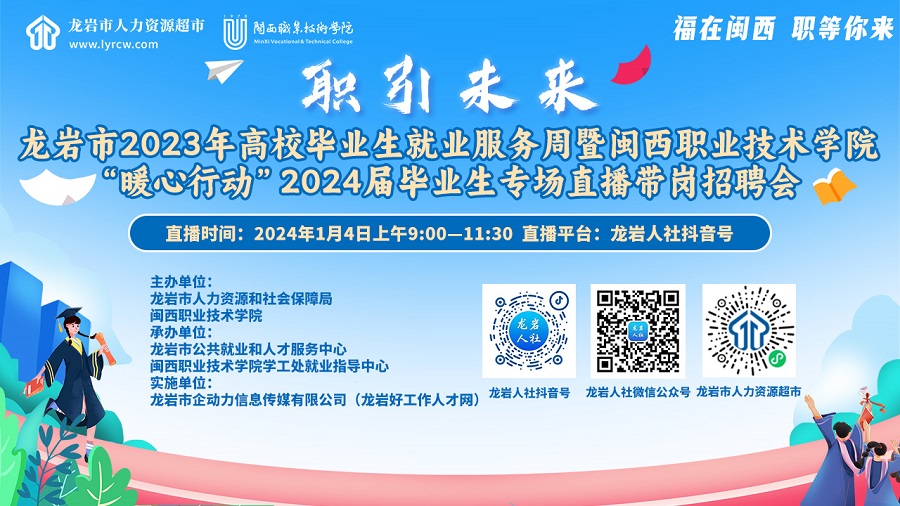 為深入貫徹黨中央國(guó)務(wù)院關(guān)于促進(jìn)高校畢業(yè)生就業(yè)工作決策部署,進(jìn)一步做好面向我市高校畢業(yè)生的就業(yè)服務(wù)工作,結(jié)合人社部2023年公共就業(yè)服務(wù)專項(xiàng)活動(dòng)安排,龍巖市人力資源和社會(huì)保障局、閩西職業(yè)技術(shù)學(xué)院定于2024年1月4日上午舉辦職引未來——龍巖市2023年高校畢業(yè)生就業(yè)服務(wù)周暨閩西職業(yè)技術(shù)學(xué)院“暖心行動(dòng)”2024屆畢業(yè)生專場(chǎng)直播帶崗招聘會(huì)。