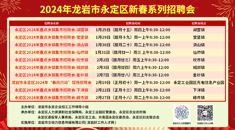 2024年龍巖各縣(市、區(qū))人社局新春系列招聘會匯總,共計30+場次招聘會,攤位有限速報名!