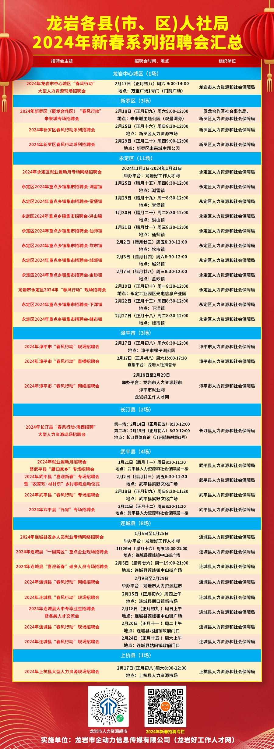 2024年龍巖各縣(市、區(qū))人社局新春系列招聘會(huì)匯總,共計(jì)30+場(chǎng)次招聘會(huì),攤位有限速報(bào)名!