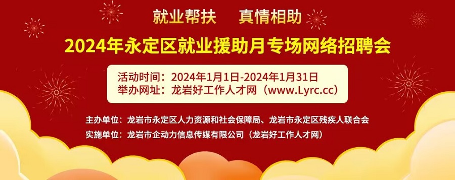 為全面貫徹黨的二十大和二十屆二中全會(huì)精神,加強(qiáng)困難群體就業(yè)兜底幫扶,龍巖市永定區(qū)人力資源和社會(huì)保障局、龍巖市永定區(qū)殘疾人聯(lián)合會(huì)定于2024年元旦、春節(jié)期間在全區(qū)組織開展就業(yè)援助月專項(xiàng)活動(dòng),集中幫扶就業(yè)困難人員就業(yè)創(chuàng)業(yè),擬舉辦2024年永定區(qū)就業(yè)援助月專場(chǎng)網(wǎng)絡(luò)招聘會(huì),具體方案如下: