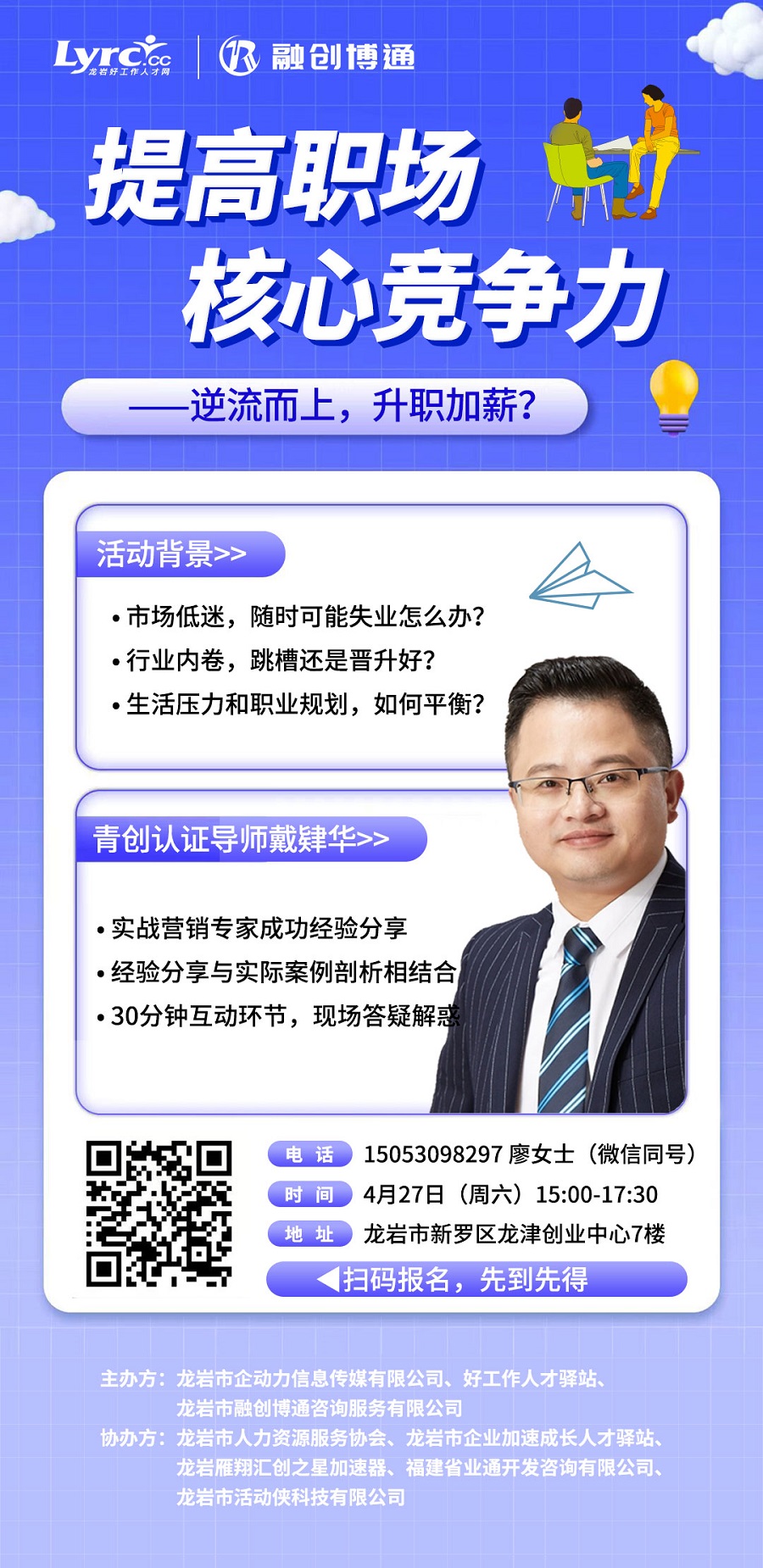好工作人才網(wǎng)和融創(chuàng)博通咨詢(xún)服務(wù)公司共同主辦,特邀福建省創(chuàng)業(yè)導(dǎo)師、福建青創(chuàng)認(rèn)證導(dǎo)師、20年實(shí)戰(zhàn)營(yíng)銷(xiāo)專(zhuān)家戴肄華,成功經(jīng)驗(yàn)分享,結(jié)合實(shí)際案例剖析,我們一起逆流而上,向升職加薪出發(fā)!同時(shí)還將預(yù)留30分鐘進(jìn)行互動(dòng),授課老師接受大家提出的各種疑問(wèn),提問(wèn)名額有限,請(qǐng)大家提前準(zhǔn)備好與主題相關(guān)的問(wèn)題,做好搶麥的準(zhǔn)備。
