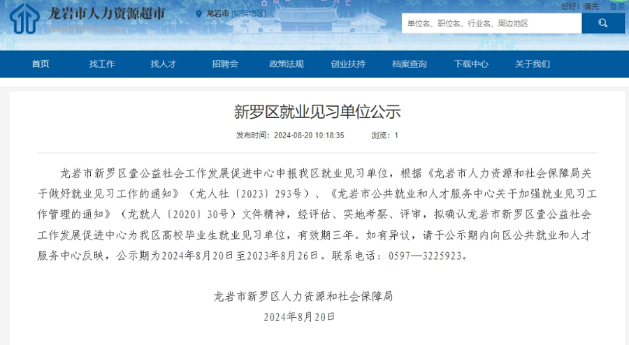 根據(jù)《龍巖市人力資源和社會保障局關(guān)于做好就業(yè)見習(xí)工作的通知》(龍人社(2023)293號)、《龍巖市公共就業(yè)和人才服務(wù)中心關(guān)于加強就業(yè)見習(xí)工作管理的通知》(龍就人(2020)30號)文件精神,經(jīng)評估、實地考察、評審,龍巖市新羅區(qū)壹公益社會工作發(fā)展促進中心被認定為新羅區(qū)區(qū)高校畢業(yè)生就業(yè)見習(xí)單位。