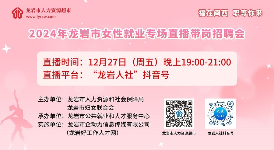 為深入貫徹落實(shí)黨中央、國(guó)務(wù)院關(guān)于做好就業(yè)工作的決策部署,積極推動(dòng)女性高質(zhì)量充分就業(yè),助力各類企業(yè)招聘到優(yōu)秀女性人才,全方位支持女性勞動(dòng)者求職就業(yè)、職業(yè)發(fā)展,龍巖市人力資源和社會(huì)保障局、龍巖市婦女聯(lián)合會(huì)于2024年12月27日舉辦“福在閩西 職等你來”2024年龍巖市女性就業(yè)專場(chǎng)直播帶崗招聘會(huì)。