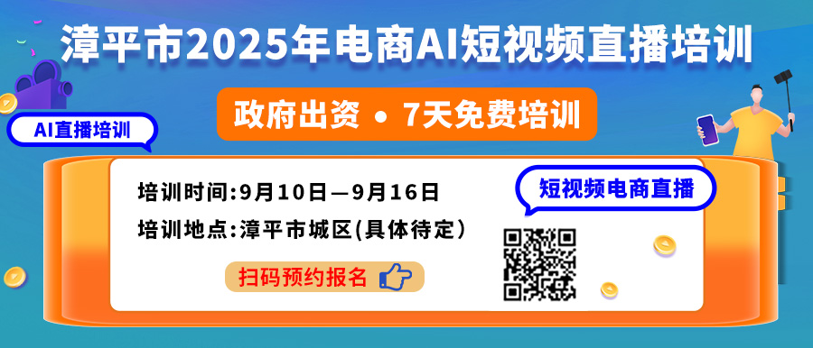 【免費培訓】漳平電商AI短視頻直播免費培訓9月10日開班!人社部部級培訓師來漳授課,名額有限速搶!