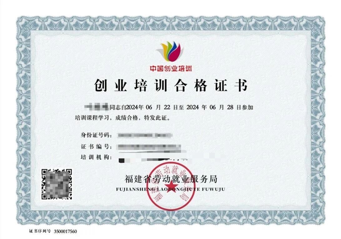 ★頒發(fā)由福建省勞動(dòng)就業(yè)服務(wù)局認(rèn)證的創(chuàng)業(yè)培訓(xùn)合格證書(shū)。學(xué)員可登錄福建省公共就業(yè)服務(wù)網(wǎng)(http://220.160.52.235:81/zscx.msw)獲取電子證書(shū)。。