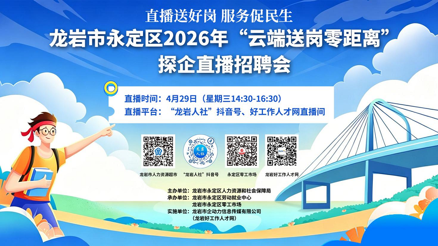 為全面落實(shí)黨中央、國務(wù)院關(guān)于穩(wěn)就業(yè)、穩(wěn)企業(yè)、穩(wěn)市場、穩(wěn)預(yù)期的決策部署,促進(jìn)人崗精準(zhǔn)匹配,聚焦重點(diǎn)群體就業(yè)需求,搭建用人單位與求職者高效對接的線下橋梁,破解雙方信息不對稱、對接效率低的痛點(diǎn),實(shí)現(xiàn)“人崗精準(zhǔn)匹配、供需雙向共贏”。龍巖市永定區(qū)人力資源和社會保障局定于2026年4月29日(星期三)下午14:30-16:30舉辦龍巖市永定區(qū)2026年“云端送崗零距離”探企直播招聘會。誠邀廣大用人單位和求職者踴躍參與!